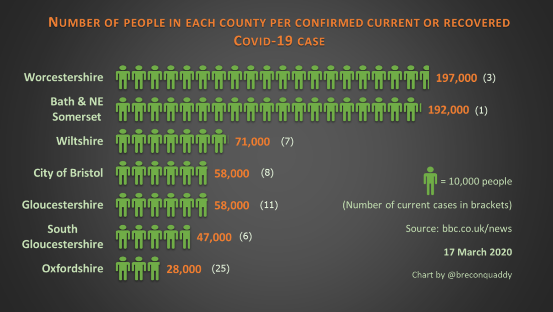 Gloucestershire currently has 11 confirmed cases of Covid-19. That’s one case for every 58,000 residents. It was only six for several days, then it kicked up on 17 March.